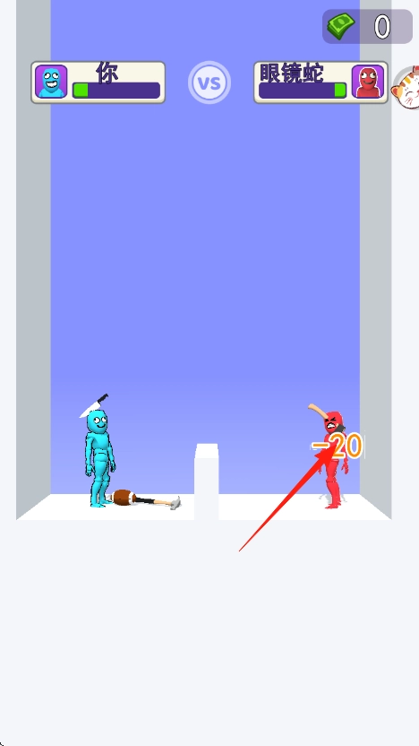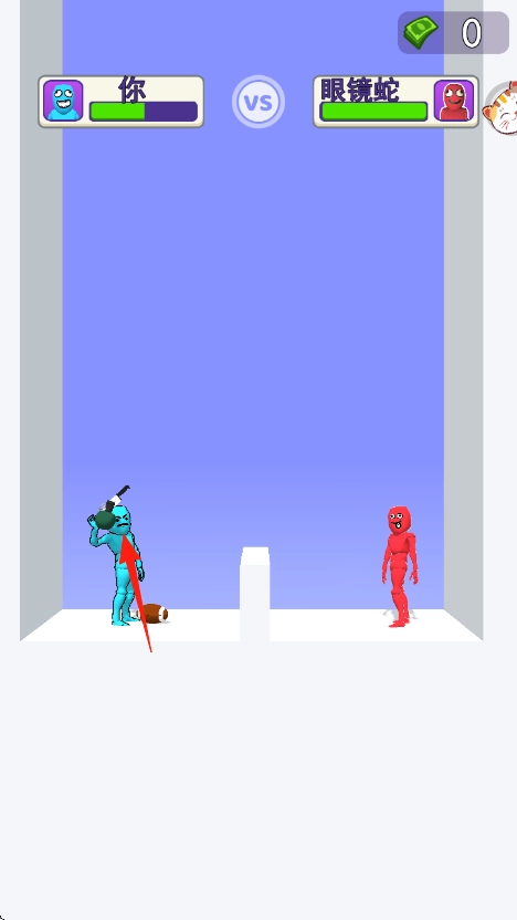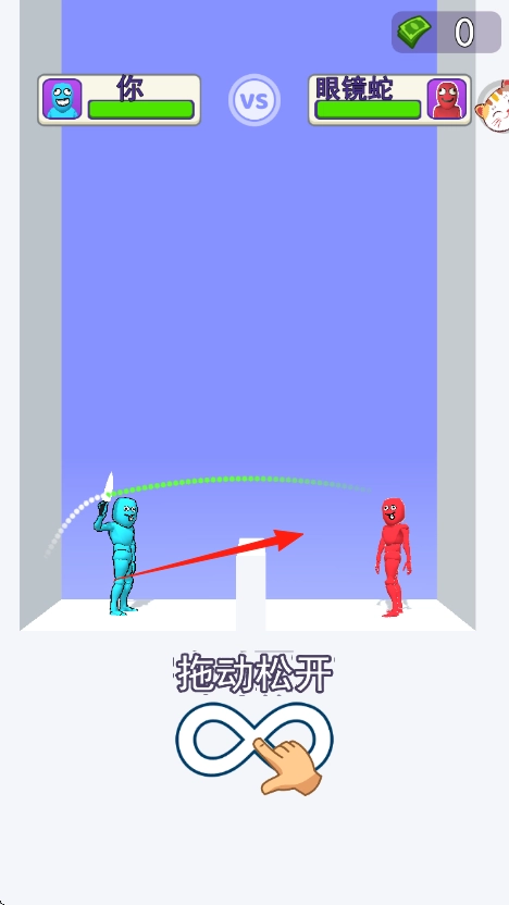 1、拖动蓝色橡皮人手中武器刀、球棒,调整力度、角度,松开投掷攻击红色敌人眼镜蛇。