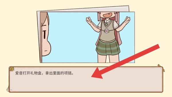 2、对话情节为爱音打开礼物盒,拿出里面的项链,呈现漫画分镜式的游戏场景,展示角色互动情节。