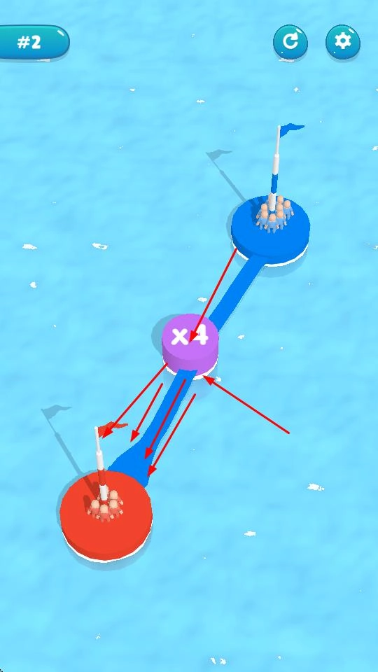3、在后续关卡中,利用带有倍数标识的紫色区域,增强蓝色阵营小人的数量或能力,提升对抗优势,完成关卡目标。