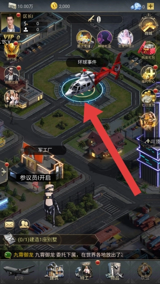 2、建筑与功能:军工厂、参议员开启建筑,环球事件直升机标识的互动内容;还有秘书、商战等功能入口。
