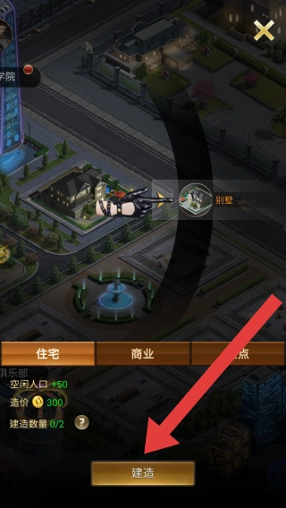 3、别墅建造所需造价300,建造数量限制0/2,空闲人口+50,点击建造的按钮方可建造。