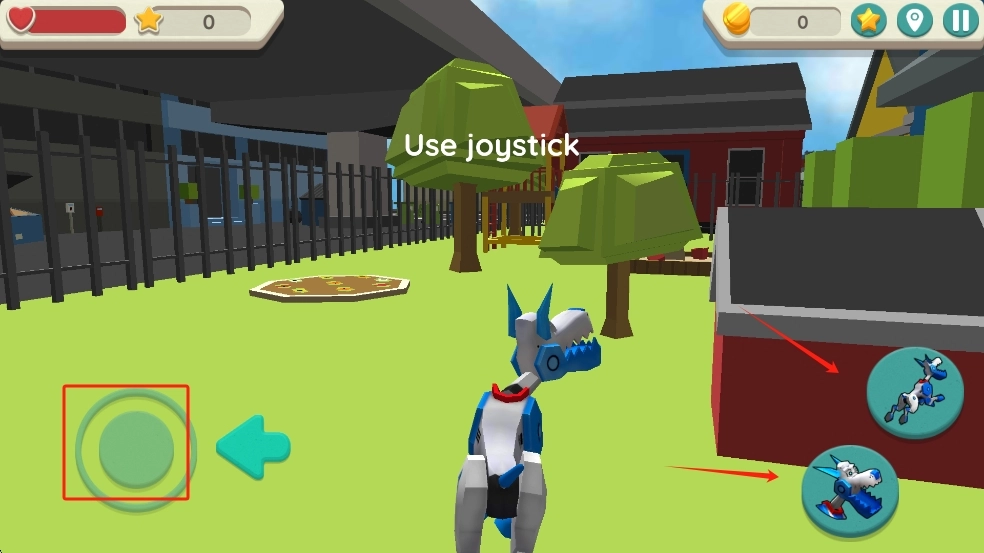 1、首先借助左侧红框内的虚拟摇杆,操控机械恐龙在场景中移动,熟悉方向与速度控制,探索围栏、树木等环境元素。