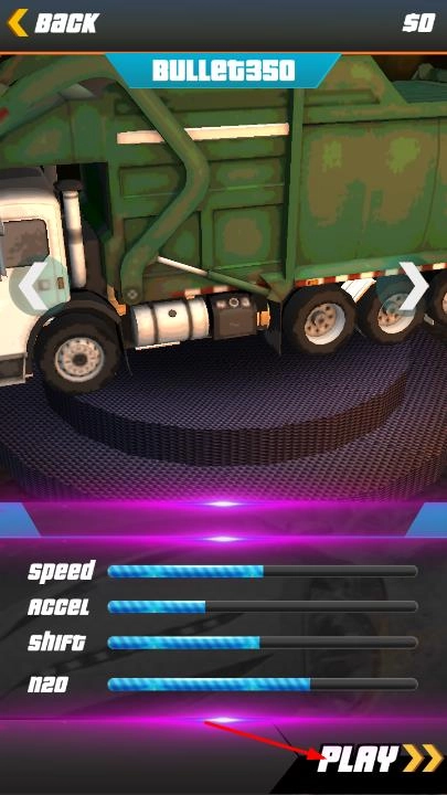 1、在车辆选择界面,查看BULLET350垃圾车的属性,点击PLAY进入场景选择。