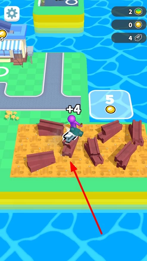 2、靠近木材堆,角色自动使用工具采集资源,获取木材等物资,同时注意收集金币,用于后续升级工具、雇佣工人。