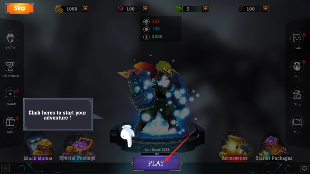 1、在游戏启动界面,点击PLAY,开启动作冒险之旅,投身奇幻战斗世界,点击按钮开始游戏。