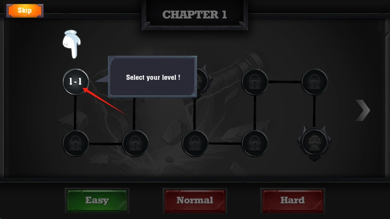 2、章节关卡选择时,按需选Easy、Normal或Hard难度,点击1-1,进入第一关挑战,点击选择关卡。