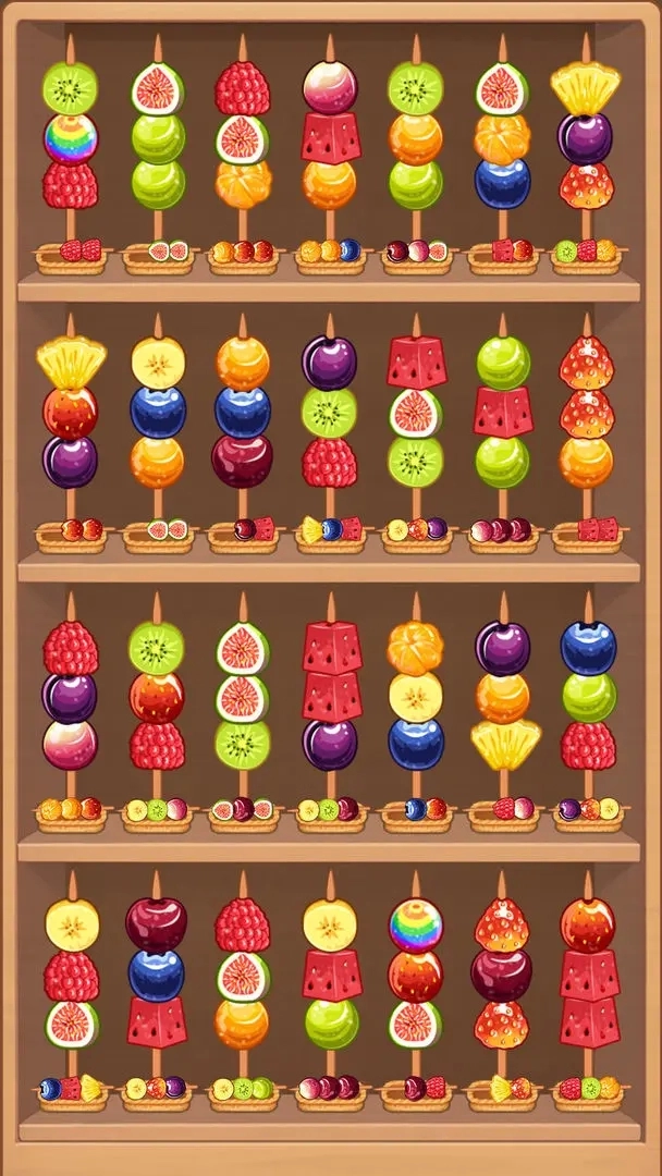 游戏里,你会看到五颜六色的卡通水果串在亮晶晶的糖葫芦签上。只要轻点相邻的水果,就能互换它们的位置。凭借巧妙的排列,把零散的水果组合成漂亮诱人的糖葫芦串吧!