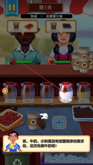 2、按提示点击【牛奶】,为顾客制作对应奶茶订单。