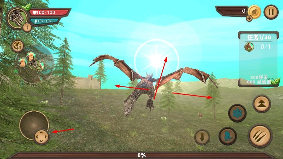 3、留意左上角血量与能量,保持状态,飞行探索场景,抵达城堡等区域解锁新内容。