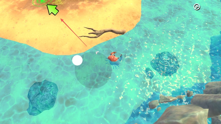 1、操控螃蟹,跟随绿色箭头方向、从水域移动到陆地、按指引探索新区域。