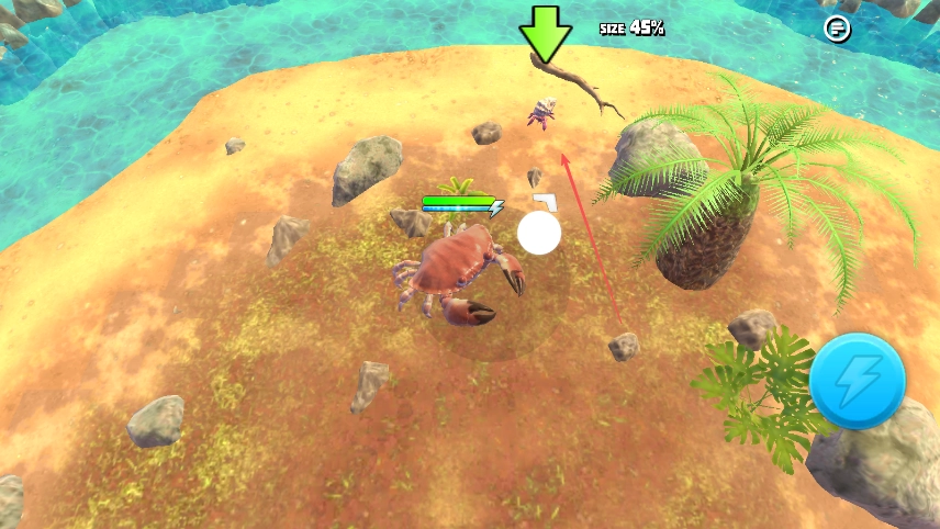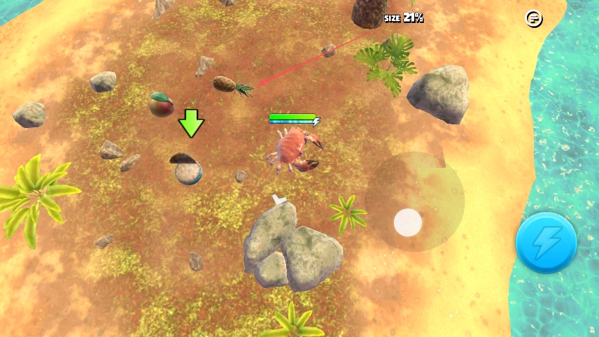 2、陆地收集菠萝等物品、使size数值增长、提升螃蟹体型与能力、准备对战。