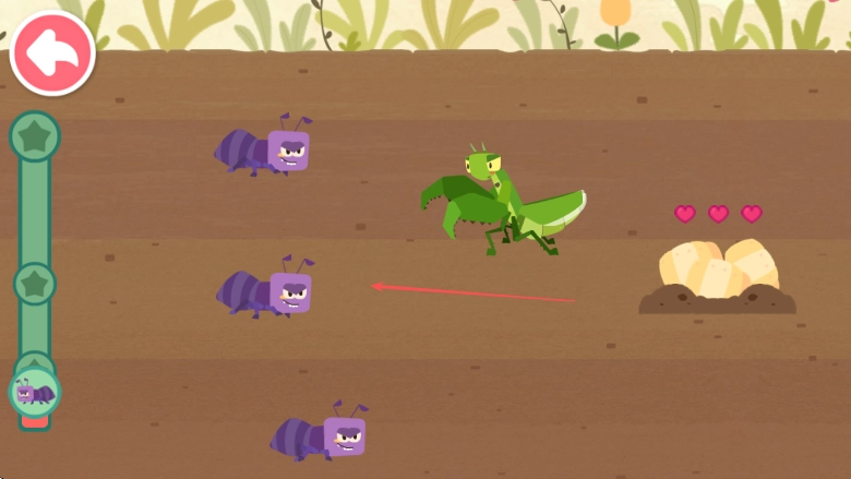 3、让螳螂攻击装备好的蚂蚁,注意屏幕右侧爱心代表生命值,避免被蚂蚁攻击过多损失生命,成功击败蚂蚁完成关卡。