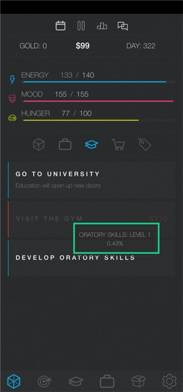 2、之后你会拥有饥饿值、情感值以及体力值来支撑工作,你能够去做任何自己想做的事情;