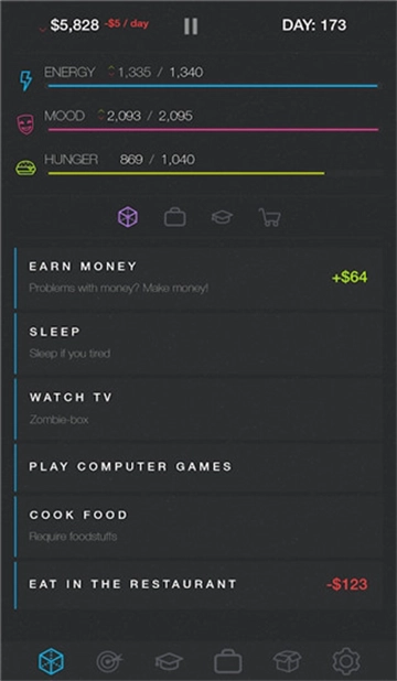 生活模拟器2(Life Simulator 2)是一款文字养成模拟游戏,玩家能在这里开启与众不同的人生体验。游戏中需要管理角色的体力、心情、饥饿度等基础状态,比如按时休息、补充食物,确保身体各项机能维持良好。随着游戏推进,玩家可以逐步培养角色能力,进行物品交易,提升各项技能,还能为角色寻找工作,从社会底层起步,一步步达成职业晋升、积累财富等人生目标。
