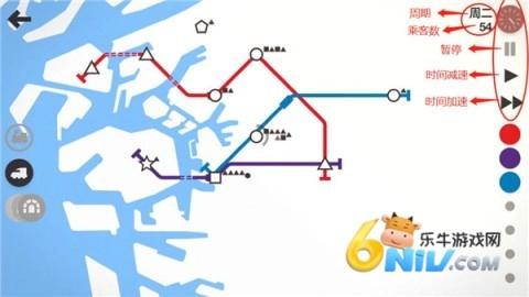 左上角的时间模块显示了周期及客运量,你可以暂停、加速或减速时间,为线路策略提供更多灵活性。