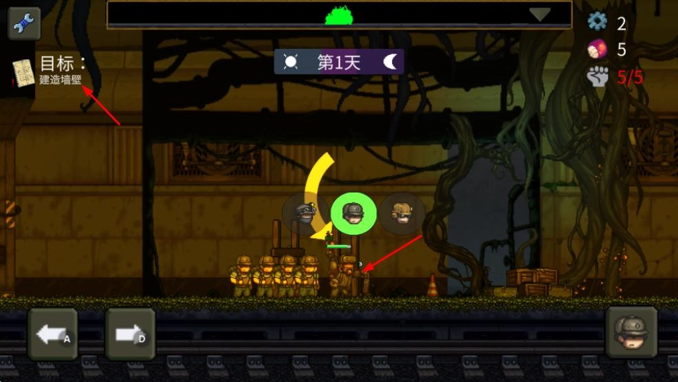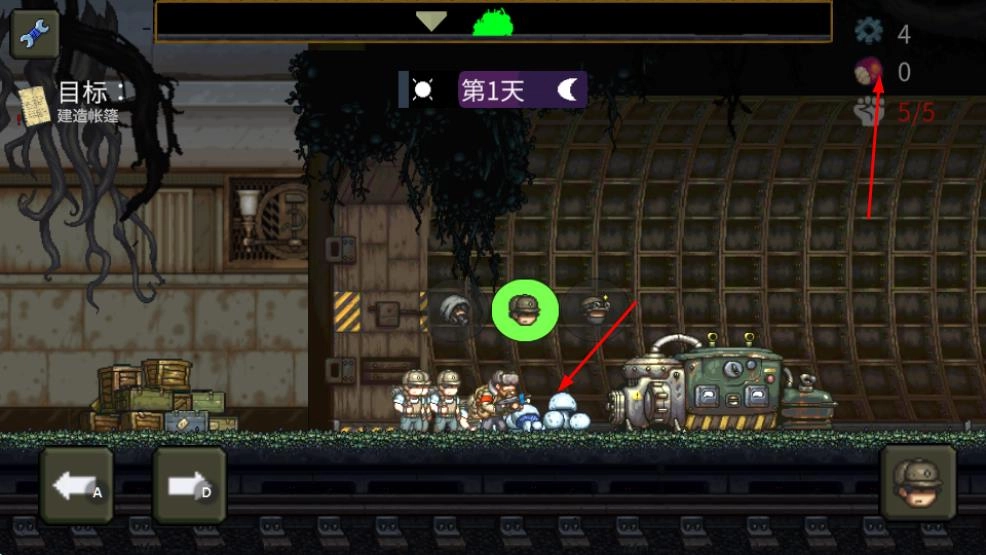 1、进入游戏第1天,通过左右方向键操控角色移动,初期目标是建造帐篷,需收集相关资源,推进任务进程。