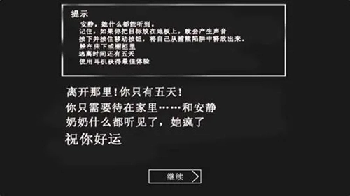 4、五天内打开大门逃离,那么奶奶就是直接追你追到门口就不追了,而后黑屏一段时间又会闪出奶奶的脸,还算挺高能的。