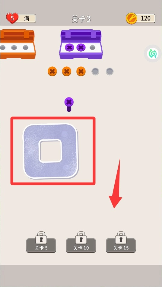 2、当三个同色螺丝相邻时,系统会自动消除它们,尽量创造连锁反应的机会,这样就能一次性清理更多障碍,提升效率。