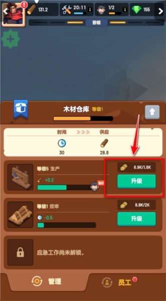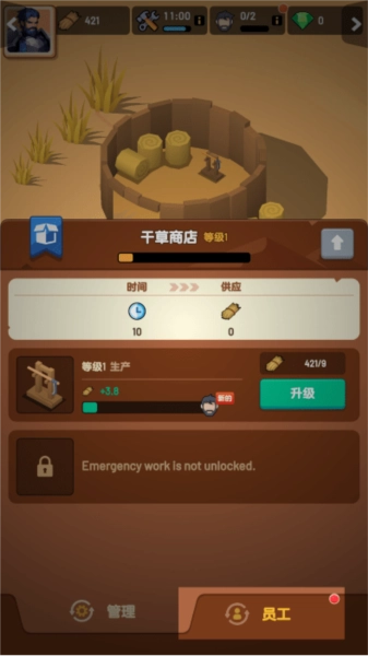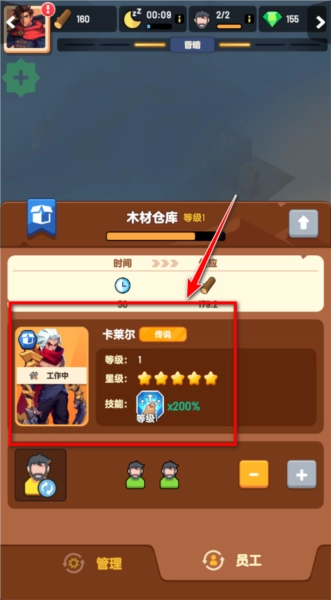 等待建造完成,点击建筑物到这个界面,点击员工这里,分配人员进行工作与探险。