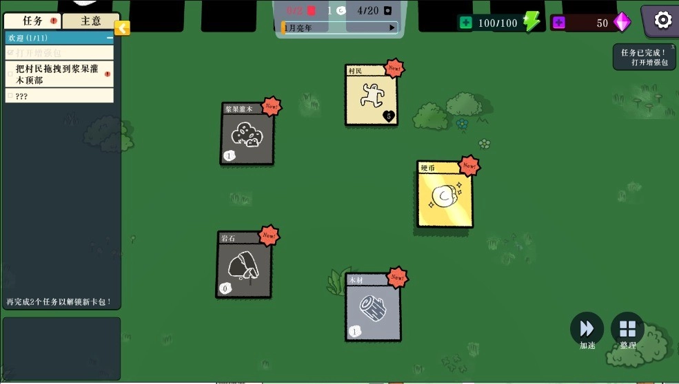 1、通过拖动卡牌就能完成种植、建造、采集等操作,这种玩法既新颖又简单,很容易上手。