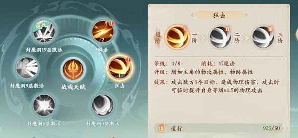 - 狂击:对单个目标发起攻击,可临时提高物理攻击力,提升数值为等级乘以1.5。该技能二阶和三阶时,均会使伤害结果额外增加10%。