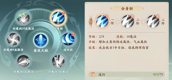 - 分身斩:对3个目标造成伤害。二阶增加1个目标,三阶技能伤害结果额外增加10%。