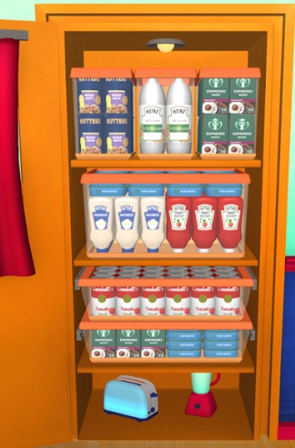 2、点击打开那个摆满物品的柜子,把里面的各类物品逐个拖出来,为放进冰箱做准备。