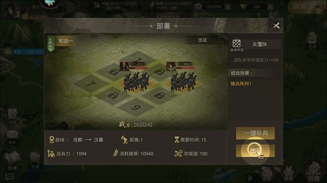 4、选择并点击“一键补兵”,为即将到来的战斗做好准备。