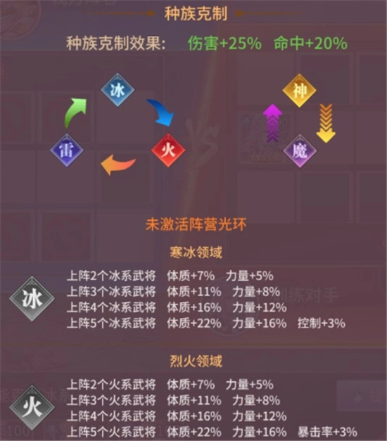 武将总共划分为冰、火、雷、神、魔五个系别,当不同系别的武将达成光环触发条件时,就能得到对应的属性光环增益效果,从而在战斗过程中实现属性方面的提升。