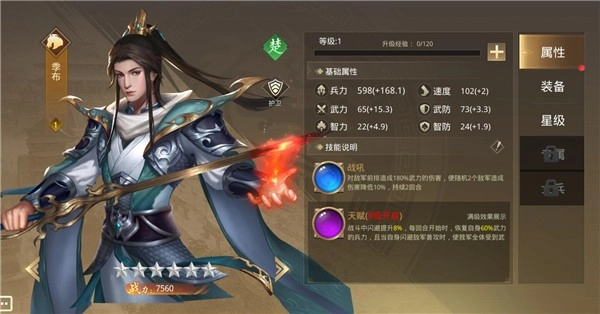 3、季布:楚国战将,战力7560,智力比较突出,技能为战吼