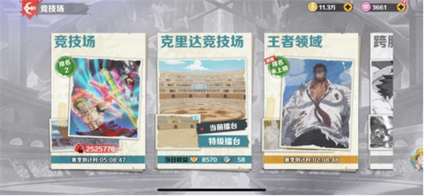 历练:是获取金币、经验值与突破剂的核心渠道,玩法包含惊险的因佩尔监狱、轻松的龙宫城以及热血沸腾的四皇挑战功能。