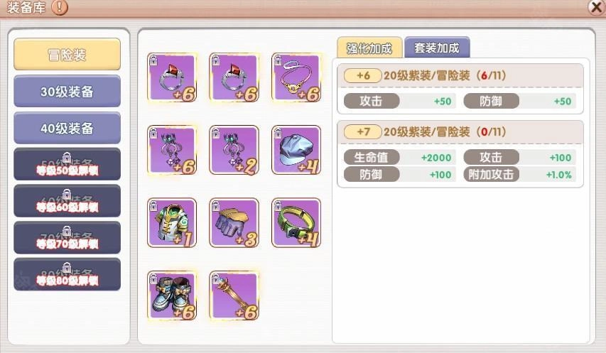 5、强化加成: 装备库内的装备会赋予额外的强化祝福效果。20级紫色装备需强化至+6方可触发该祝福;30级及以上时,仅橙色传说装备具备提供强化加成的资格,且同样需满足强化+6的条件。祝福效果随等级提升而增强:20级装备的祝福上限为+7,30级可提升至+8,40级则能达到+9。