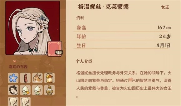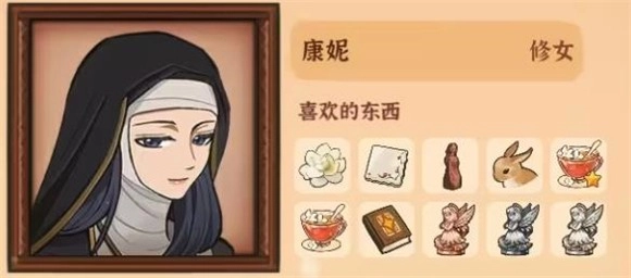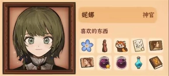 5、妮娜,喜欢的物品有勿忘我、火山女神木雕、唱诗班乐谱集、小熊猫、莫娜肖像、葡萄果酱、吐真剂、《占卜的起源》