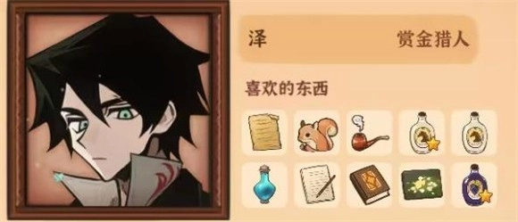 6、泽喜爱的物品包括《魔物研究笔记》、棕色烟斗、松鼠、香醇马奶酒、吐真剂、《猎物定价规则》、《火山法典》、《白花》以及热葡萄酒。