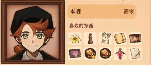 11、本森,喜欢的物品有金色兰花、火山女神木雕、香香的毛巾、山羊、本森肖像、烧烤龙虾肉、魔神药水、《绘画主题表现》