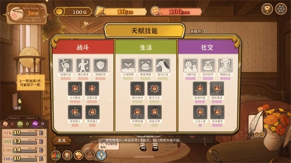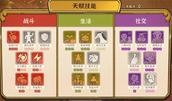 3、社交:社交板块第一行的三个技能建议全部点满。聊天的加成效果最为直接,每回合能加2点好感,从夏火年开始算的话,能累积增加10×2×3=60点好感,而且不需要消耗行动力,是很实在的好感提升方式。送礼的加成则适合针对特定角色,实现定点高效涨好感,主要用在前期找探险伙伴,或是最后阶段好感度不够时快速补分。小费的加成搭配七八月份的浴场翻倍机制,可以用来快速刷钱。第二行优先点满甜言蜜语,打折天赋除了刷肥料外用处不算突出,但能配合三四月份的打折活动,倒卖之前入手的武器,再结合领主任务,也能完成一波原始资本积累。第三行根据自身情况选择,推荐点人见人爱,能加快好感增长速度。