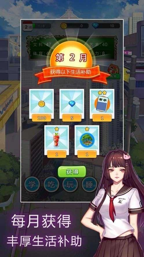 可以分别对学生的学习、饮食、娱乐和睡眠这四项进行安排,这些安排会分别对文科、理科、艺术、体育、魅力以及压力的数值产生影响。