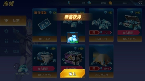 在弹窗当中点击确认,不需要支付,成功获得对应的数量的钻石。