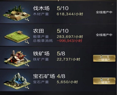 提升粮田、木场、宝矿、铁田的等级能快速增加资源产出,为大型建筑的升级提供充足的资源支持。基础建筑等级的提升,对战斗力的增长有着显著的助力,还能为后续的发展筑牢坚实的根基。(ps:别忘了使用资源增产道具哦)