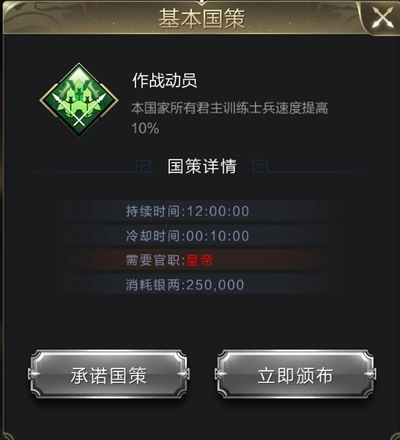 皇城争夺结束后,皇帝可以开放一些国策,其中就包括增加全服所有人训练速度的【作战动员】,在国策期间暴兵可以有效提升效率。