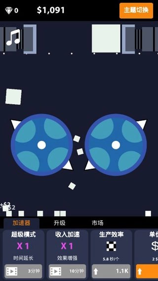 1、游戏玩法:整体而言较为简单,主要包含加速器、升级和市场这三个要素,右上角还可自行切换主题。
